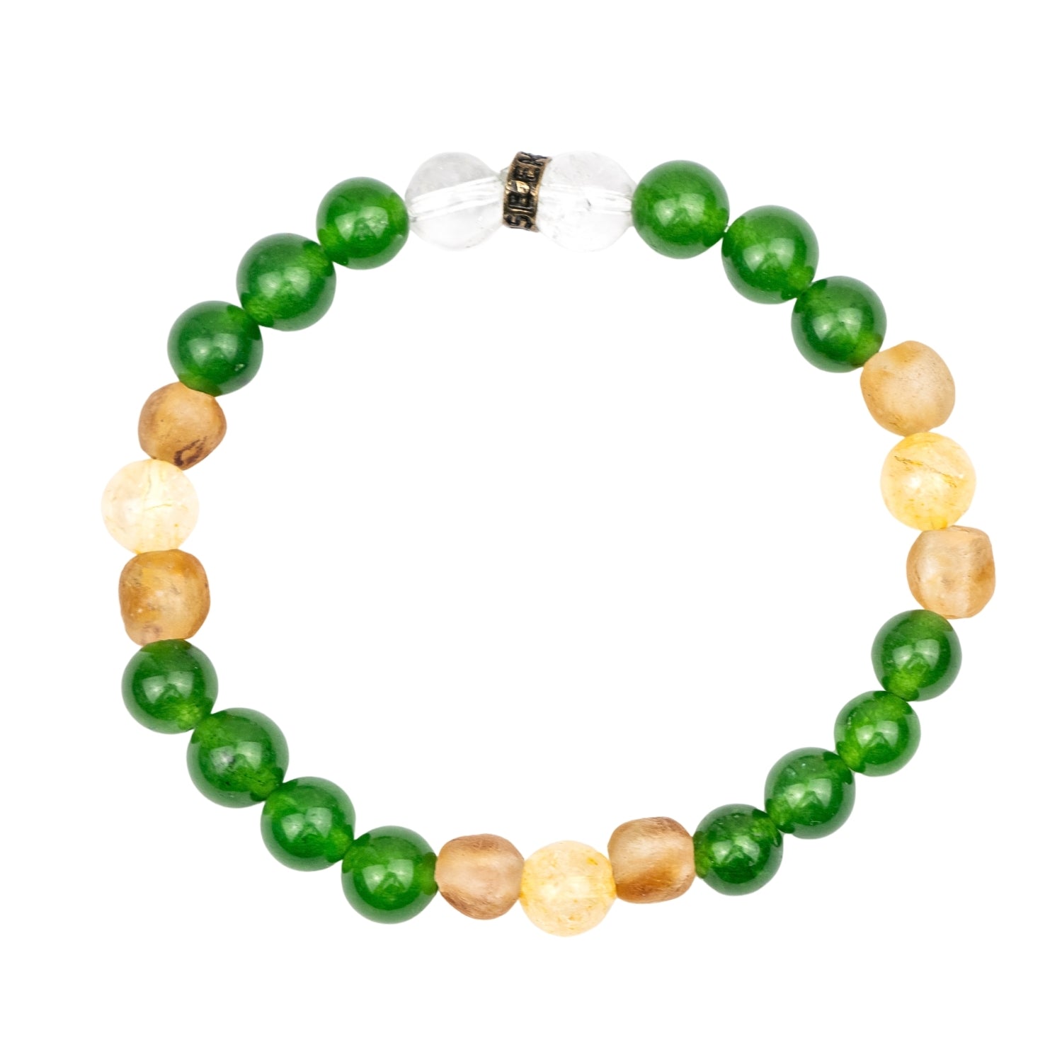 Celebrate the enduring bonds of friendship with the Mustang Spirit Bracelet, a unique piece of jewelry that captures the essence of our high school years. Made with Jade, Citrine and vintage glass beads, this exquisite bracelet is more than just an accessory—it's a symbol of the longevity and warmth of the connections forged during those unforgettable days.